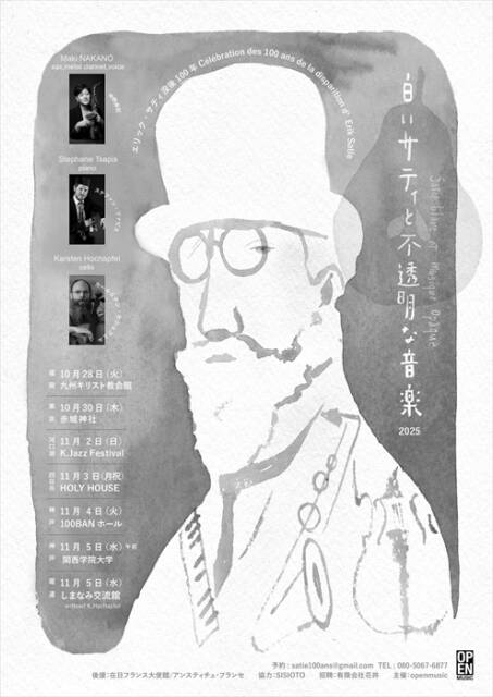 サティの音楽と精神に新たな光を当てるこのツアー、四日市会場の「HOLY HOUSE」(四日市市松原町)では、11月3日(月・祝)にトリオが紡ぐ新たな音が披露される。