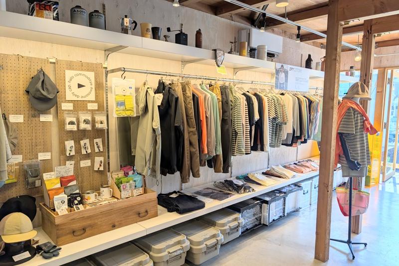 店内にはアパレルショップも併設。衣料回収や再生ポリエステルを活用した、街でも山でも使えるおしゃれで機能的なアイテムが揃います。