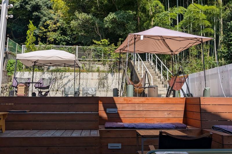 お店の裏には開放的なウッドデッキテラスが広がります。ハンモックに揺られれば疲れも癒やされます。
