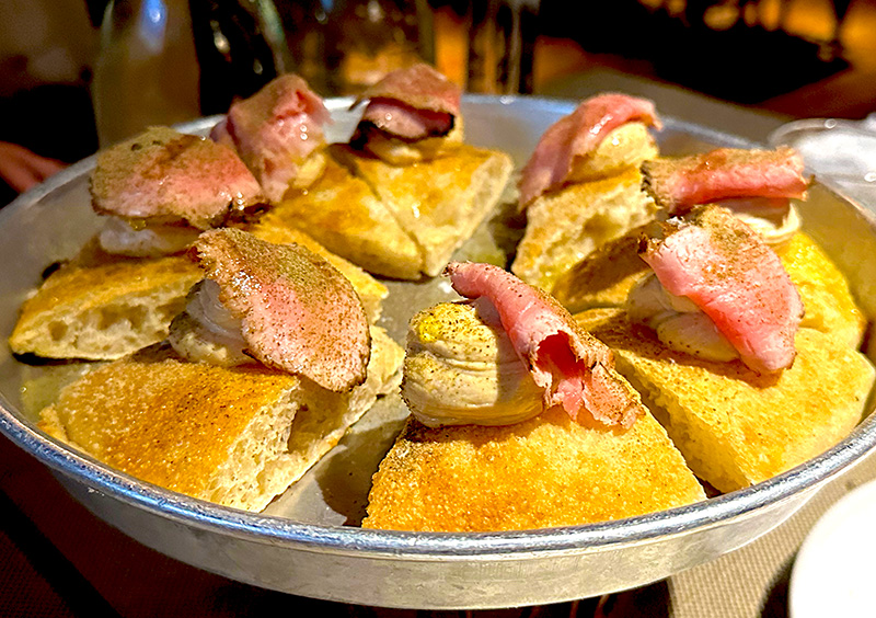 テーブルに並んだのは、4種類のフォカッチャと3種類のピッツァ。シェアスタイルで、本場の味を心ゆくまで堪能します。