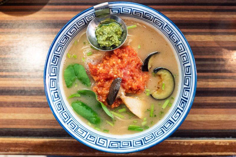 人気ナンバー2の「とまとんこつ」はうま味たっぷりな濃厚豚骨スープを土出しに、さらにグルタミン酸のうま味成分を持ち合わせたトマトを加えた一杯。トッピングにキノコ、ナスなどを添えたイタリアンライクなラーメンで、“味変”用にと添えられたバジルソースによって、もう一つの顔も見せてくれる。決して突飛なアレンジではなく、出汁のうま味成分を軸に考案された理に適ったラーメンだ。