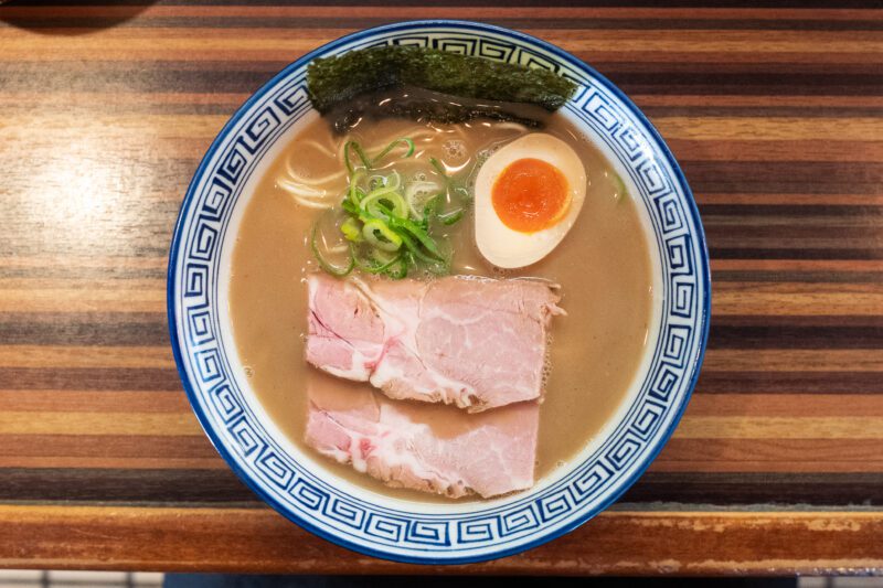 今回、取り上げるのは、春日市の至宝、「濃厚とんこつ かなで食堂」。店主・松尾龍太郎さんがこの店を開業したのは2011年のことだ。それまでは関東のラーメンチェーンでエリアマネージャーとして働いていたそう。マネージャー的な経験がそうさせたのか、「かなで食堂」を開くにあたり、提供するラーメンの差別化を考えた松尾さん。そこでメニューの筆頭においたのが「濃厚豚骨」だった。豚骨ラーメンをやると決めた以上、そのリングに上がらなければならない。創業から半世紀以上の老舗が今も現役で人気を博している福岡の豚骨ラーメンシーンにおいて、濃厚豚骨という選択は「新参者ですから」という松尾さんなりの戦略だった。