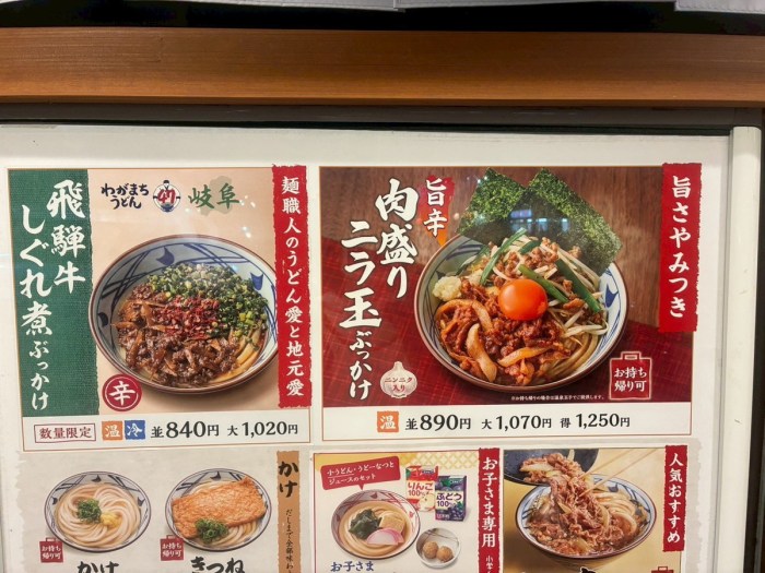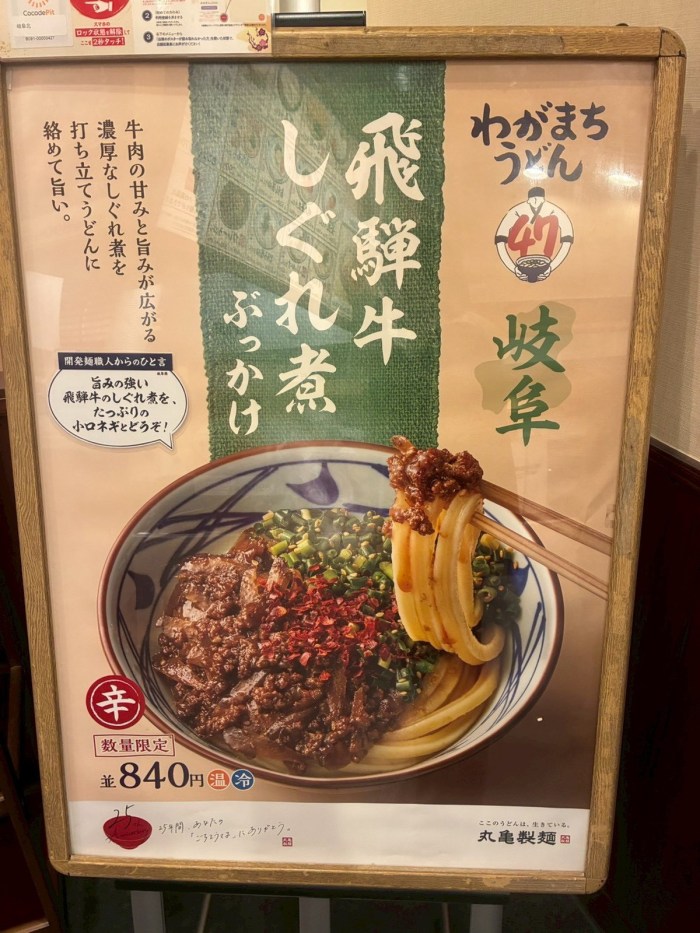 岐阜といえば飛騨牛! と誰もが思いつくブランド牛を、しぐれ煮にしてうどんに乗せた一皿だ。この機会に是非飛騨牛を楽しもうと、地元の丸亀製麺へ足を運んだ。