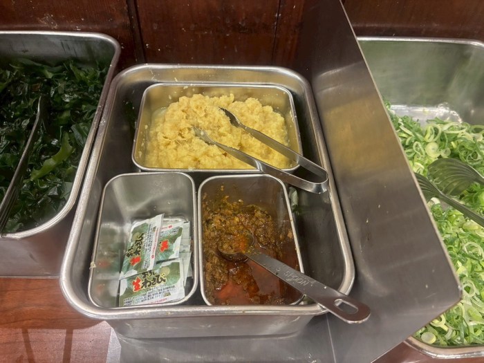 1つ目は、この一杯で完成されているので、丸亀の薬味・トッピングゾーンは今回はスルーした方がいい。しび辛ラー油とかのせたくなるのはめちゃくちゃ分かるが、味のバランスが持っていかれるような気がする。