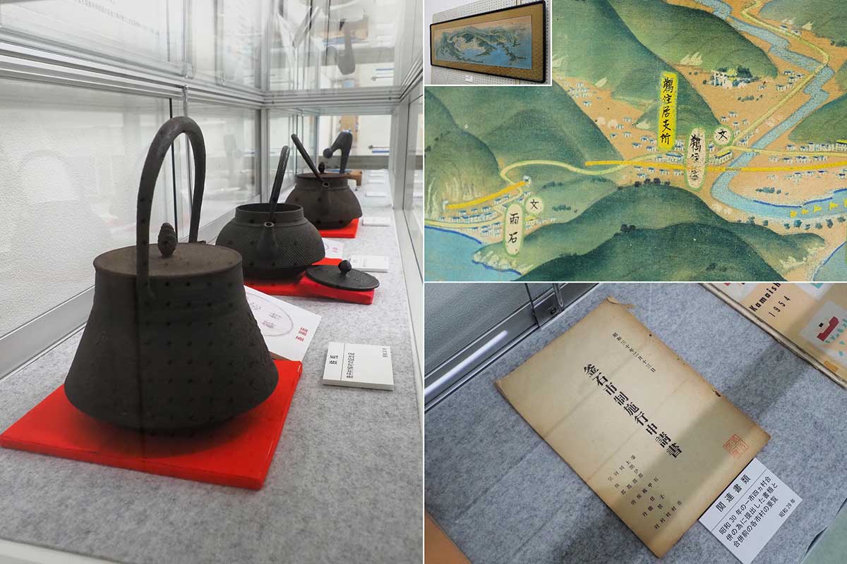 55年の合併のために提出した申請書、合併前最後に作られた各市村の要覧、解村や合併を記念した鉄瓶なども関係資料として40点ほど並ぶ。明治から昭和期に名をはせた鳥瞰図(ちょうかんず)作家、吉田初三郎(1884~1955)作の釜石図も掲示。市制施行を記念したもので、精巧な地図とはひと味違った筆使いや彩色に情趣がある。