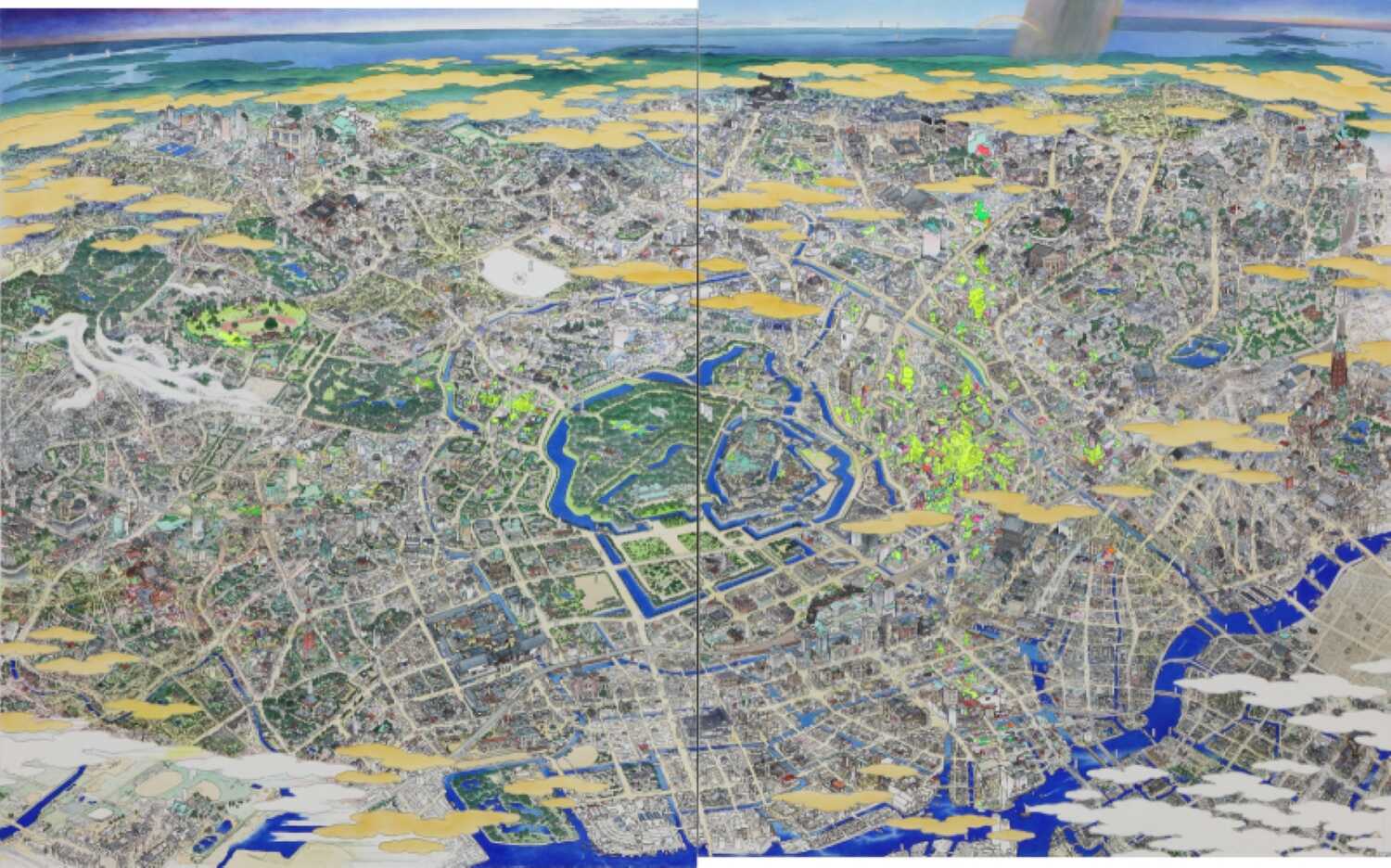 実際の場所を題材とした日本画の名作が、現地の写真とともに並べられる本展。2023年開催時よりも、新たに選んだ作品が多数登場する。中でも見どころのひとつは、2019年放送のNHK大河ドラマ『いだてん~東京オリムピック噺~』でオープニングのタイトルバックに登場した山口晃《東京圖 1・0・4輪之段》。皇居を中心とした東京の風景が、画家独特の鳥瞰図で描かれている点に注目したい。