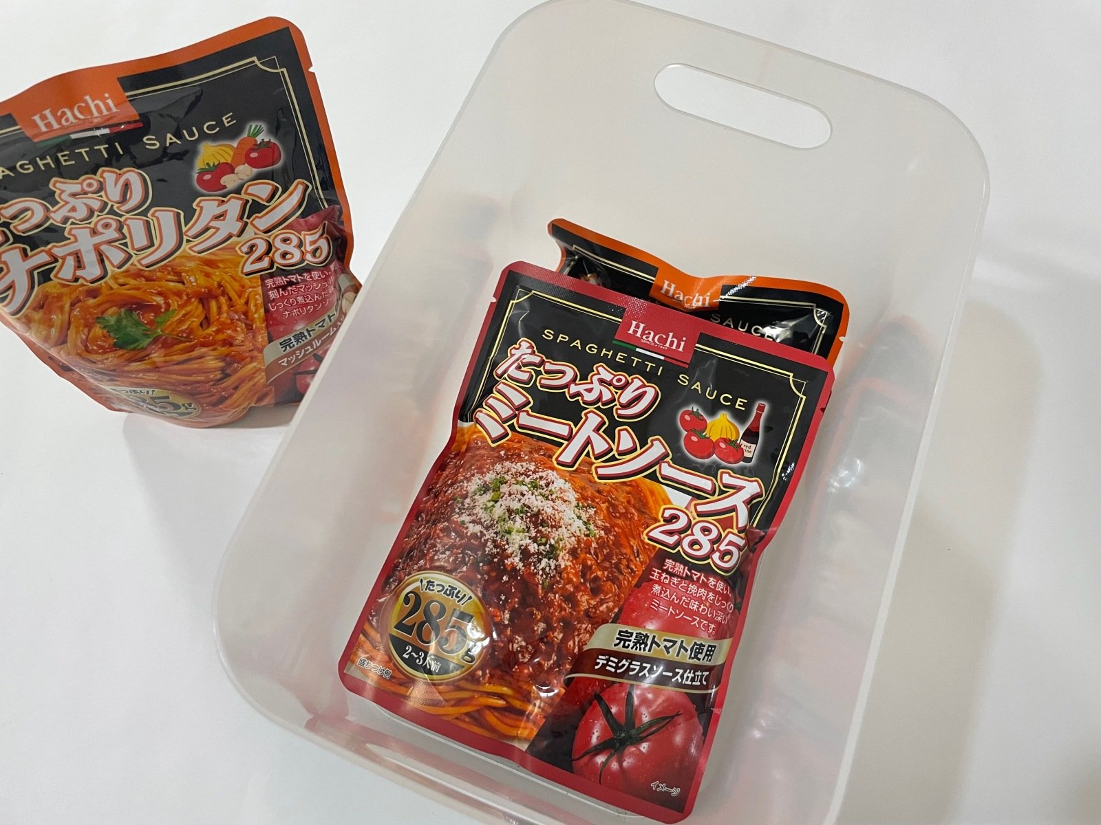 非常用ストックとして便利なレトルト食品。まとめ買いしてストックしている方も多いと思いますが、袋状のパッケージは自立しにくく、並べてもすぐに倒れてしまうのが悩みどころ……。