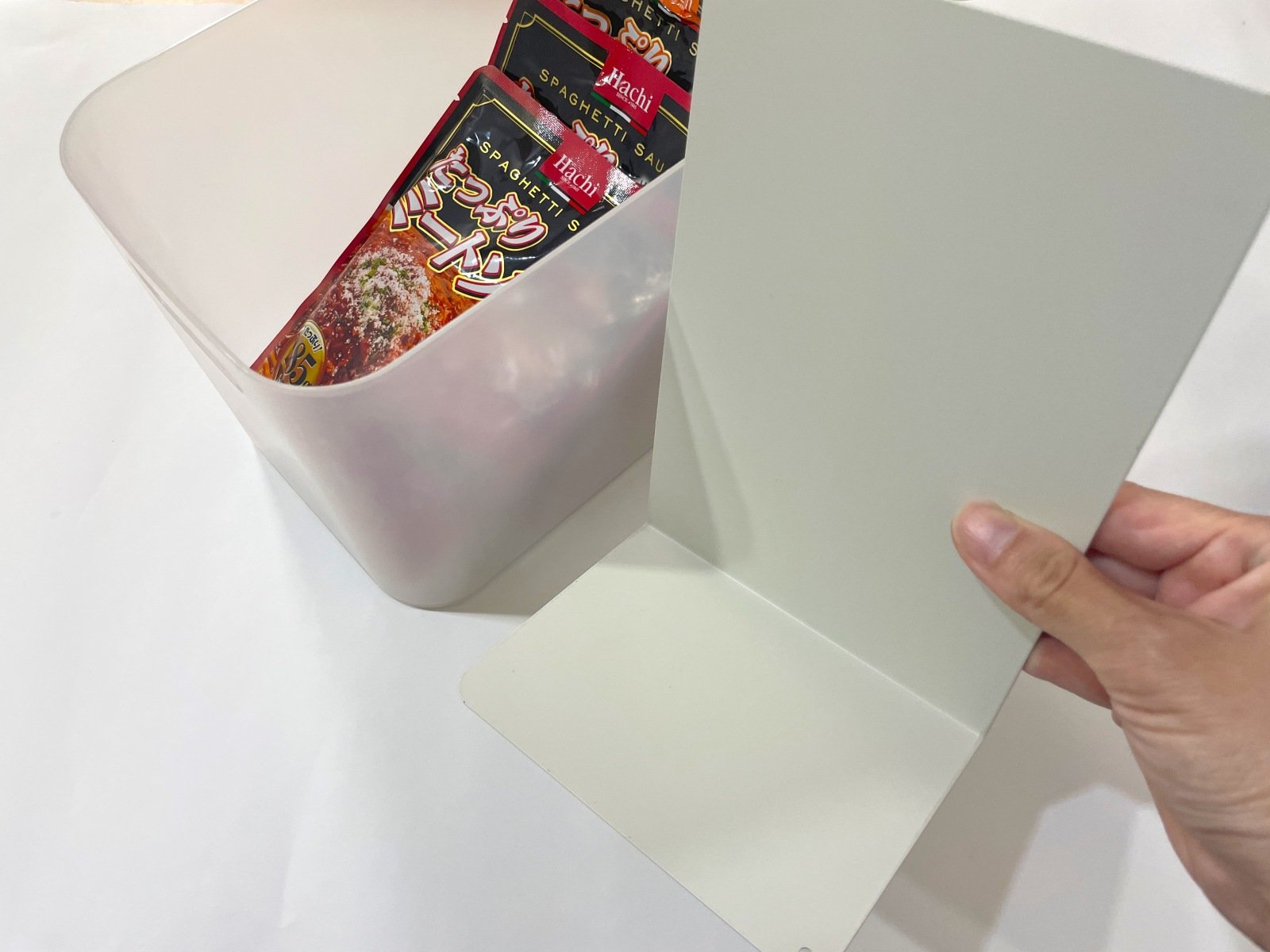 そんなときに役立つのが、ブックエンドを使った整理ワザです。本来は本を立てるためのアイテムですが、仕切りとして使うことで、レトルト食品をキレイに立てて収納できます。