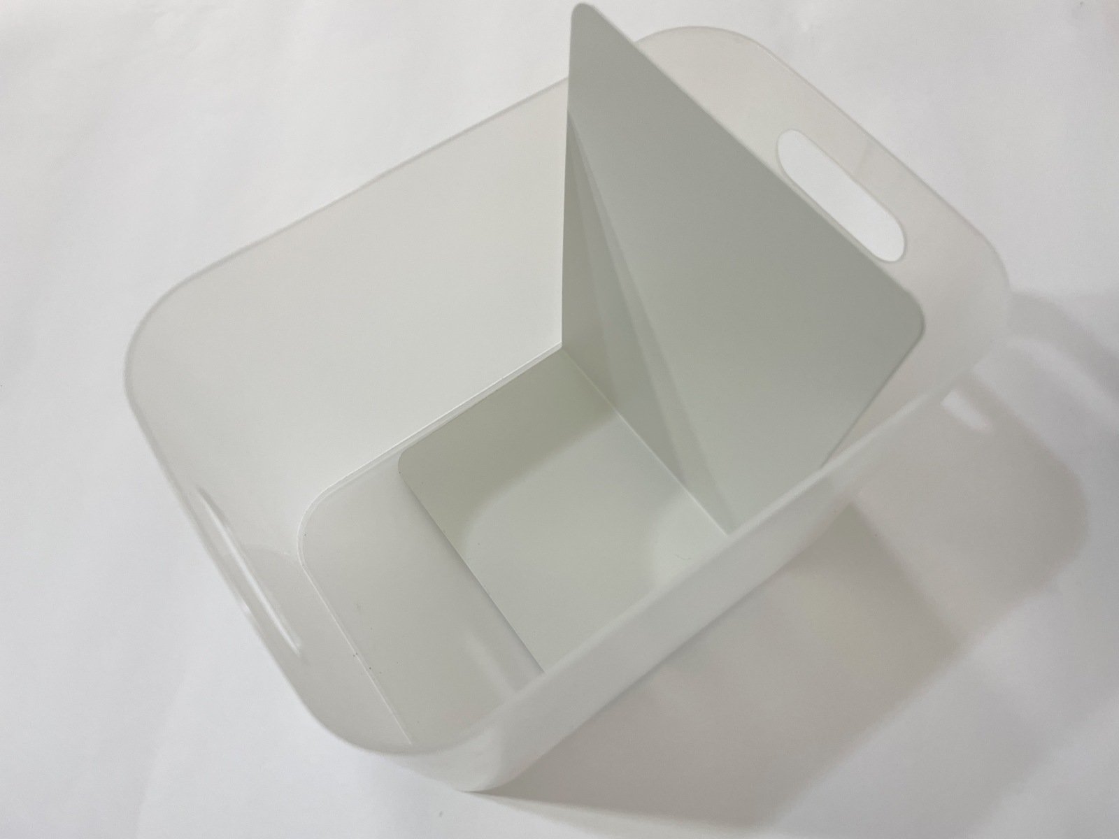 袋の形が不安定でもしっかり自立。倒れる心配がなくなり、出し入れがスムーズに! ブックエンドをボックスの中で移動してスペースを調節できるのが便利なポイントですよ。