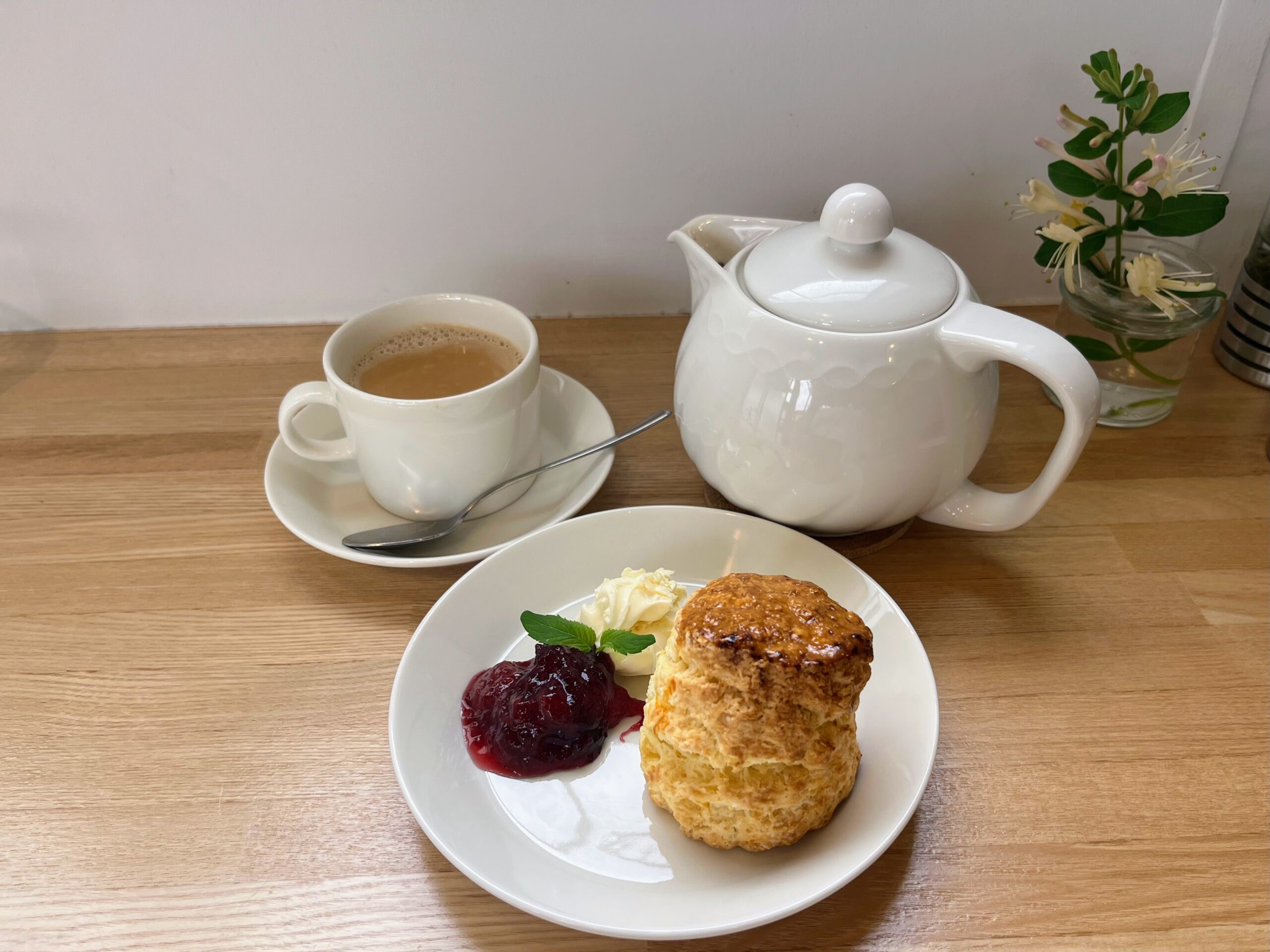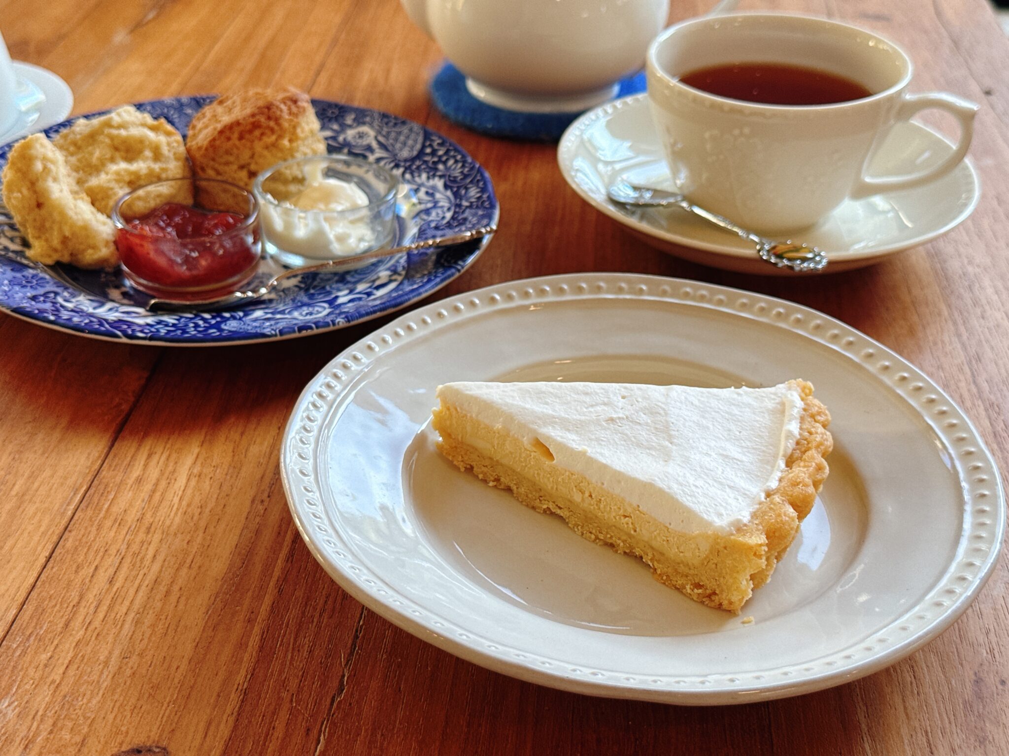 アンティーク家具に囲まれた店内では、発酵バターや新鮮な卵を使った店主こだわりのタルトやクリームビスケットを提供。