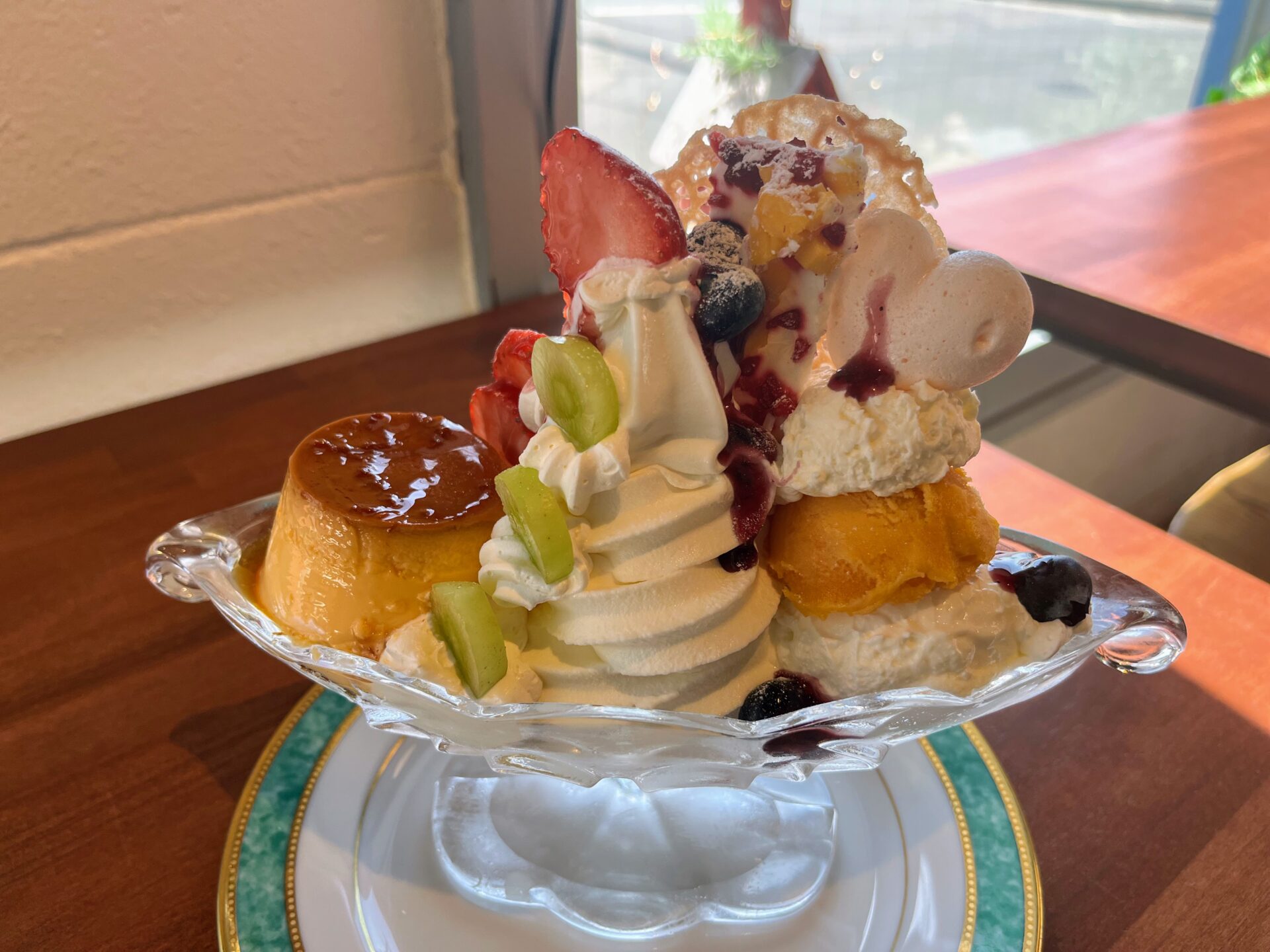 名物の「プリンパフェ」は、しっかりめプリンを主役に、数種のスイーツが層をなす贅沢な一品。