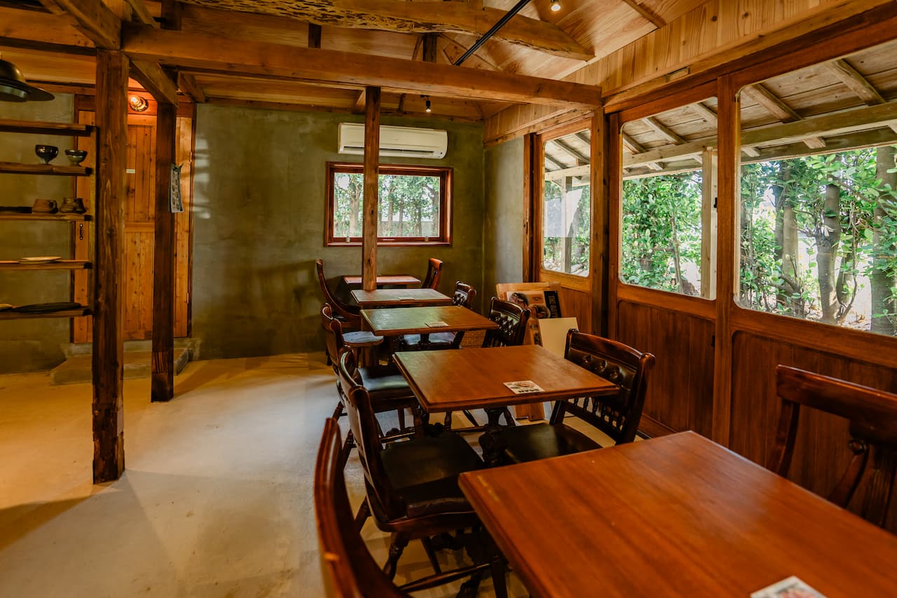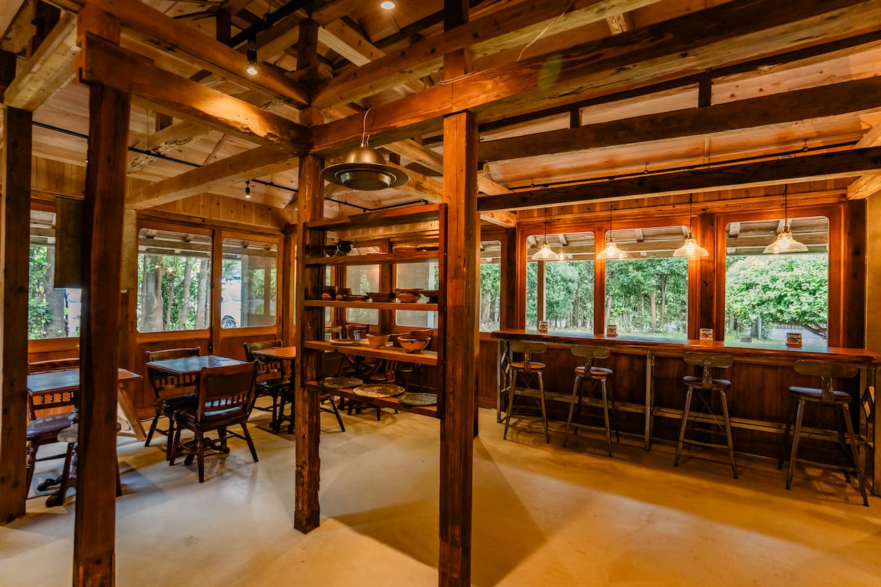 近隣に住むベテラン大工と店主、そしてスタッフが、2ヶ月半にわたり毎日通い詰めて空間づくりに取り組み、細部までこだわり抜いたセンス光る古民家カフェが完成。 店内のテーブルは、アメリカの古道具のような風合いの板を裁断して脚を取り付けた手づくりのもの。アメリカンレトロな椅子を合わせ、やわらかな灯りのペンダントライトが空間を包み込みます。 どこを切り取っても絵になる、落ち着いた雰囲気が魅力です。
