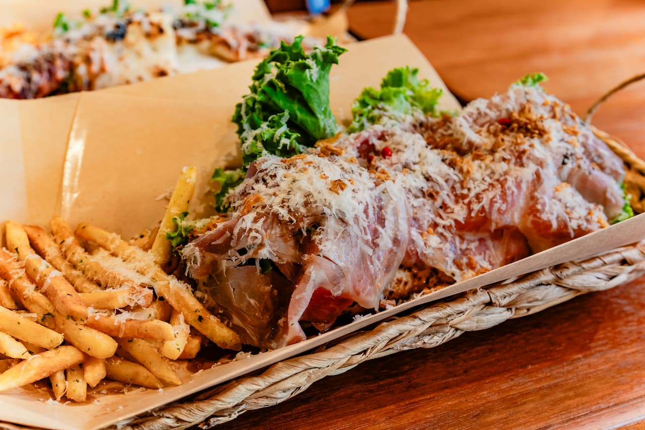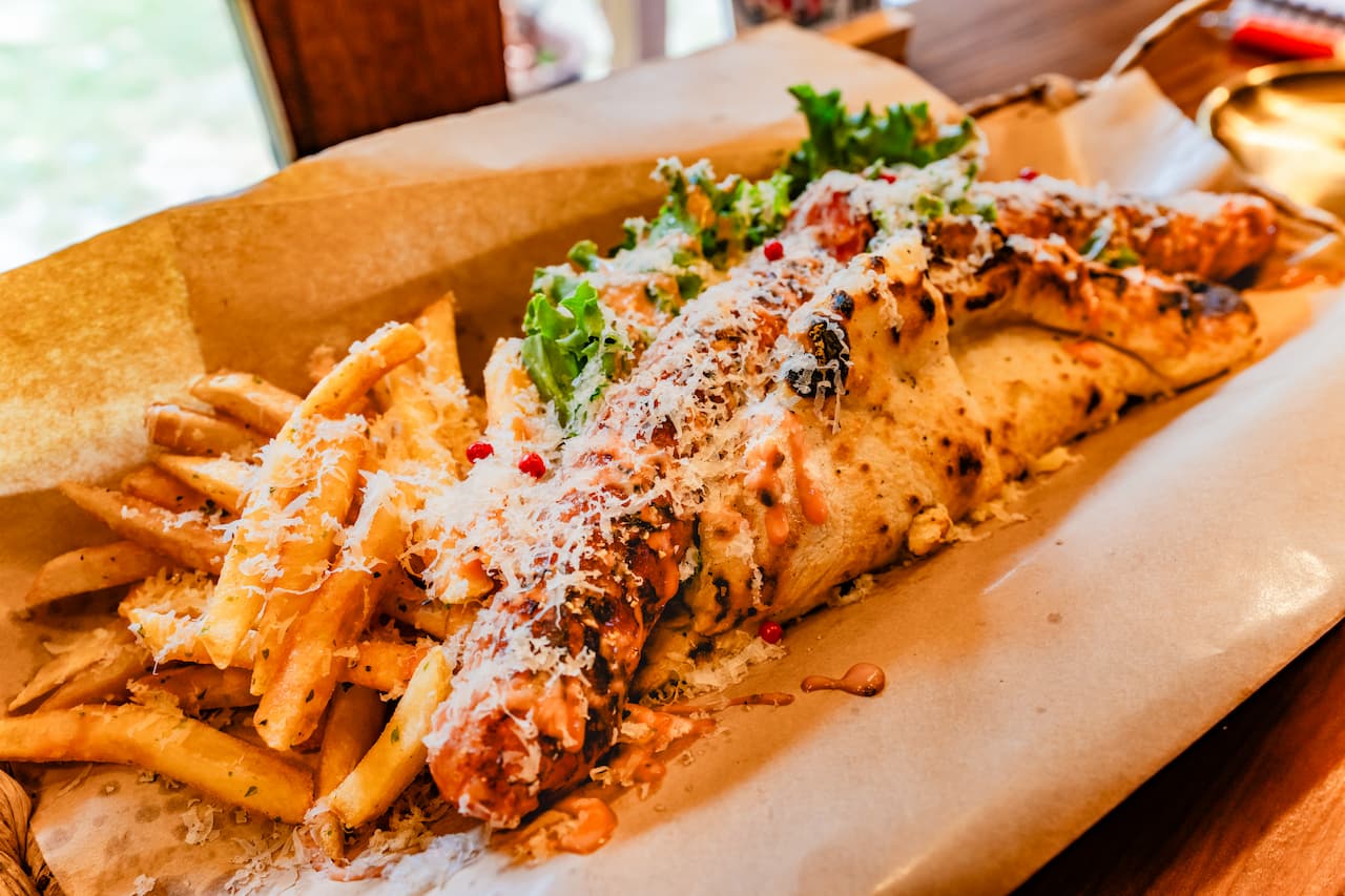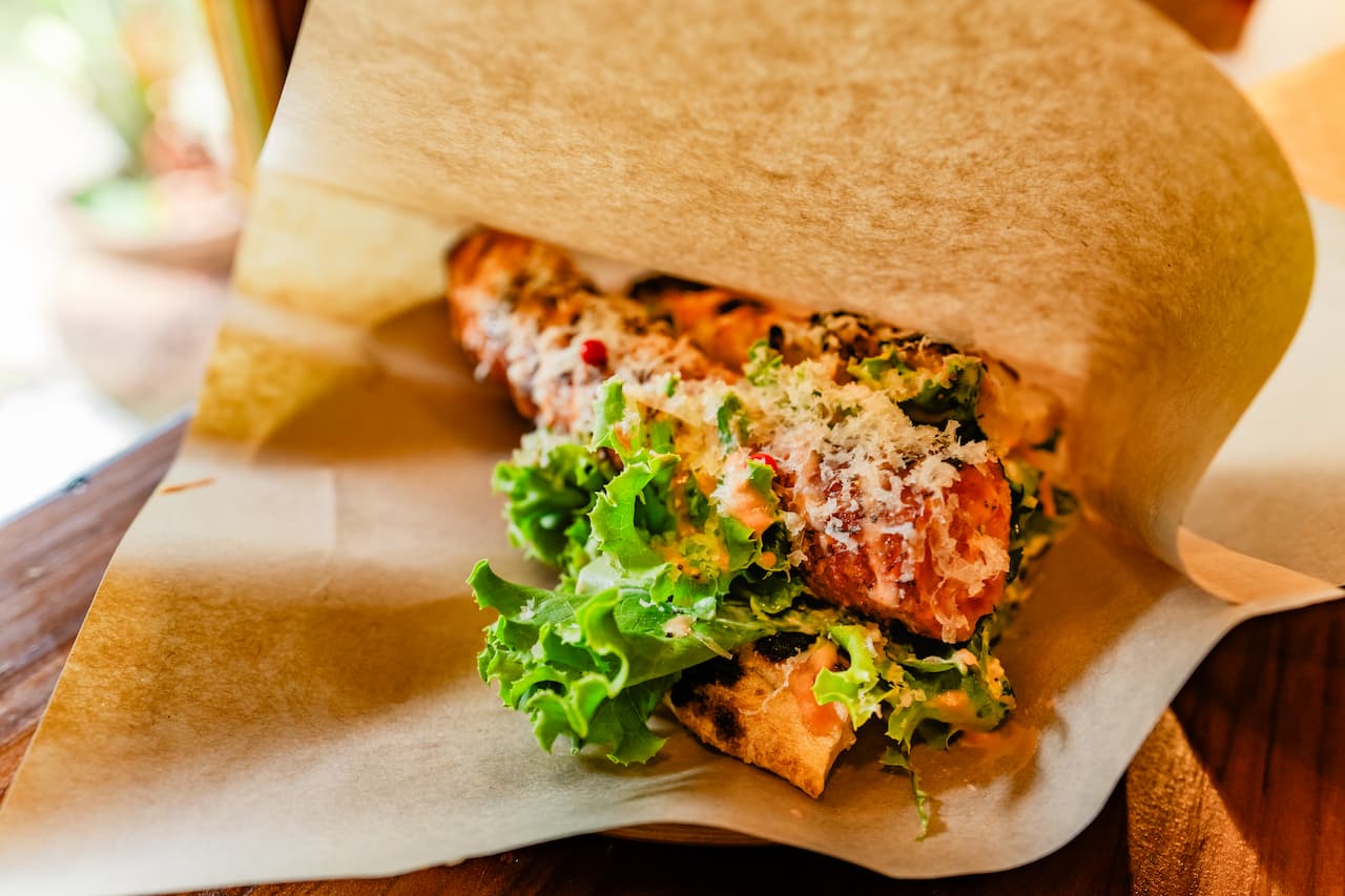 モチモチのピザ生地とシャキシャキした野菜の食感のコントラストも絶妙です。タマネギのほどよい辛味がアクセントとなり、さっぱりと仕上げられたソースが全体をバランスよくまとめています。 海や川でたっぷり遊んだあとの一品や、海辺に持っていくランチにもぴったり!ボリュームも味も大満足の“がっつり系サンドイッチ”です。