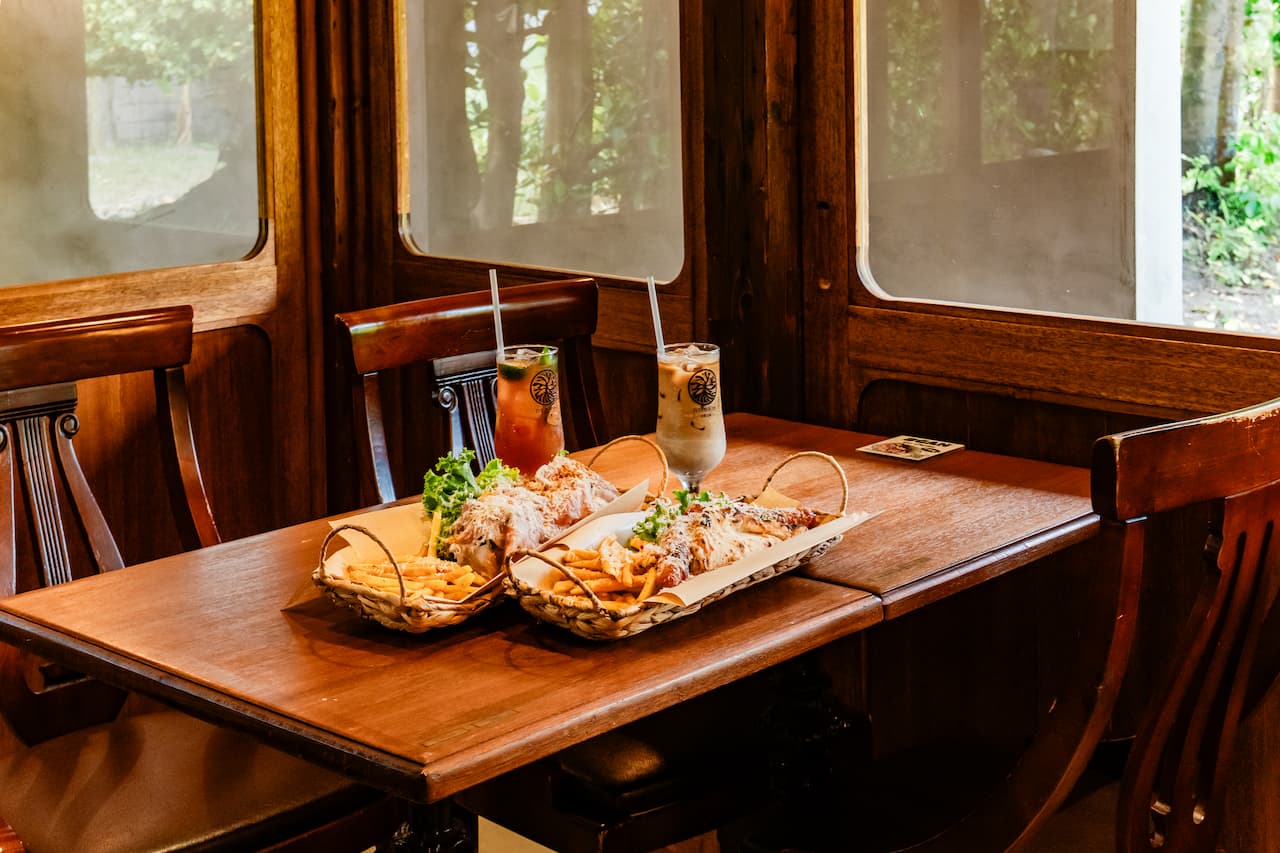 カウンターに4席と2人掛けテーブル6卓をゆったりと配置し、中央を広く取った開放的な空間。 カウンター席からは、庭の向こうに抜ける青い空や、中央にそびえるガジュマルの木を眺めながら、のんびりとした時間を過ごせます。