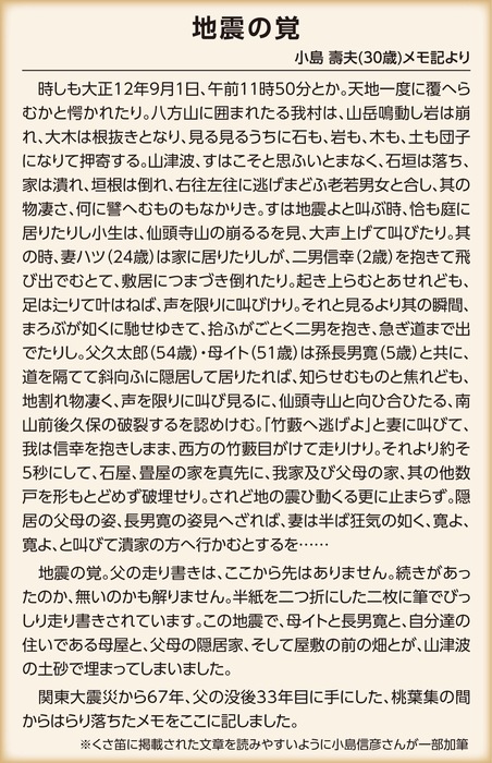 この『地震の覚』は、小島会長の祖父・壽夫さんが書いたもの。書によると「関東大震災から67年、父の没後33年目」の年に発見したメモ書きを邦子さんが『くさ笛』に掲載した。手記は「半紙を二つ折にした二枚に筆でびっしり走り書きされています」とくさ笛に記載されている。