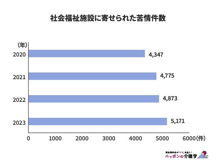 実際、介護施設に寄せられる苦情は年々増加傾向にあり、2020年から2023年にかけて苦情総数は4,347件から5,171件へと増えています。