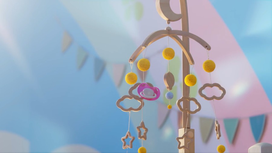たしかに青い瞳やくるっと跳ねた淡い金髪、パステルブルーカラーのガラガラに、星や雲をモチーフにしたメリーなど、ファンの間では「マリオギャラクシー関連の映像では?」という予想も広がっています。