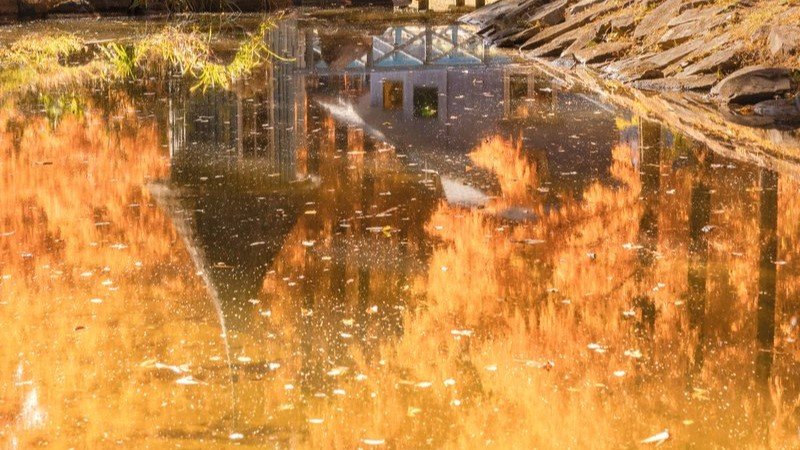 黄金色に染まったメタセコイア並木と青い建物が水面に映り込み、絵本の中のような世界が広がっている。