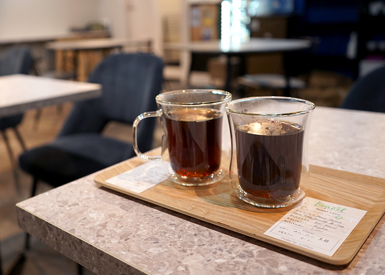 コーヒーはその場で飲み比べるとそれぞれの特徴が鮮明に現れるから面白い。この日いただいたコスタリカの中浅煎りは、とろりとした舌触りにマスカットのような甘い香りとジャスミン茶に似た後味が印象的。ブラジルの中深煎りは、舌に広がる苦味と鼻を抜ける香ばしさのコーヒーらしい風味。豆の個性をクリアに魅せる店主の腕あってこそのメニューだ。