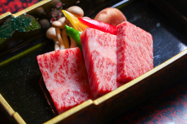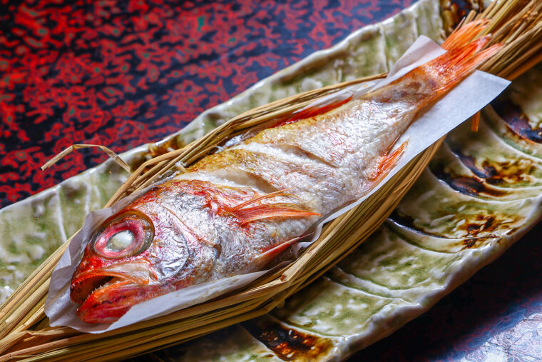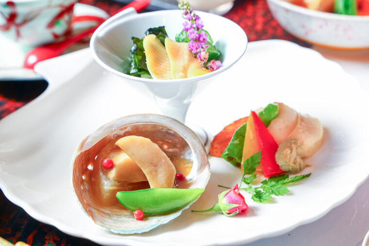 料理全9品の『夕食部屋食 山海美食の饗宴プラン』は、霜降りが多くやわらかな『村上牛の鉄板焼き』、「白身のトロ」と称されるほど脂がのった『のど黒の藁焼き 藻塩添え』、そして荒波に育まれた『鮑の三種盛り』、炊きたての『岩船産コシヒカリ』など、村上の食を堪能できる贅を尽くした内容です。