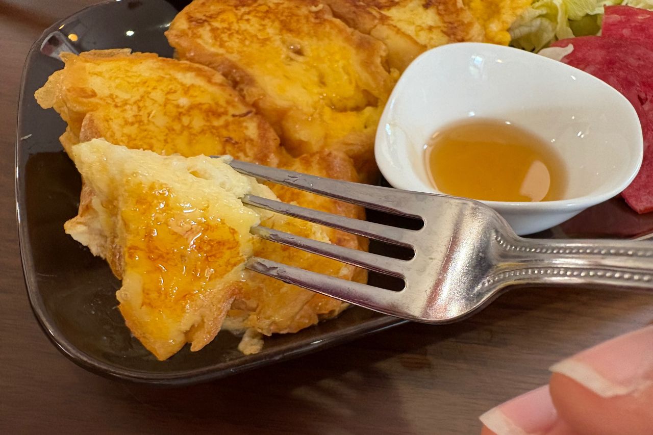 フレンチトーストは添えつけのメープルシロップをかけて食べるとちょうどよい甘さです。3枚もあるのでボリュームはありますが、ペロリと軽く食べ切れます。