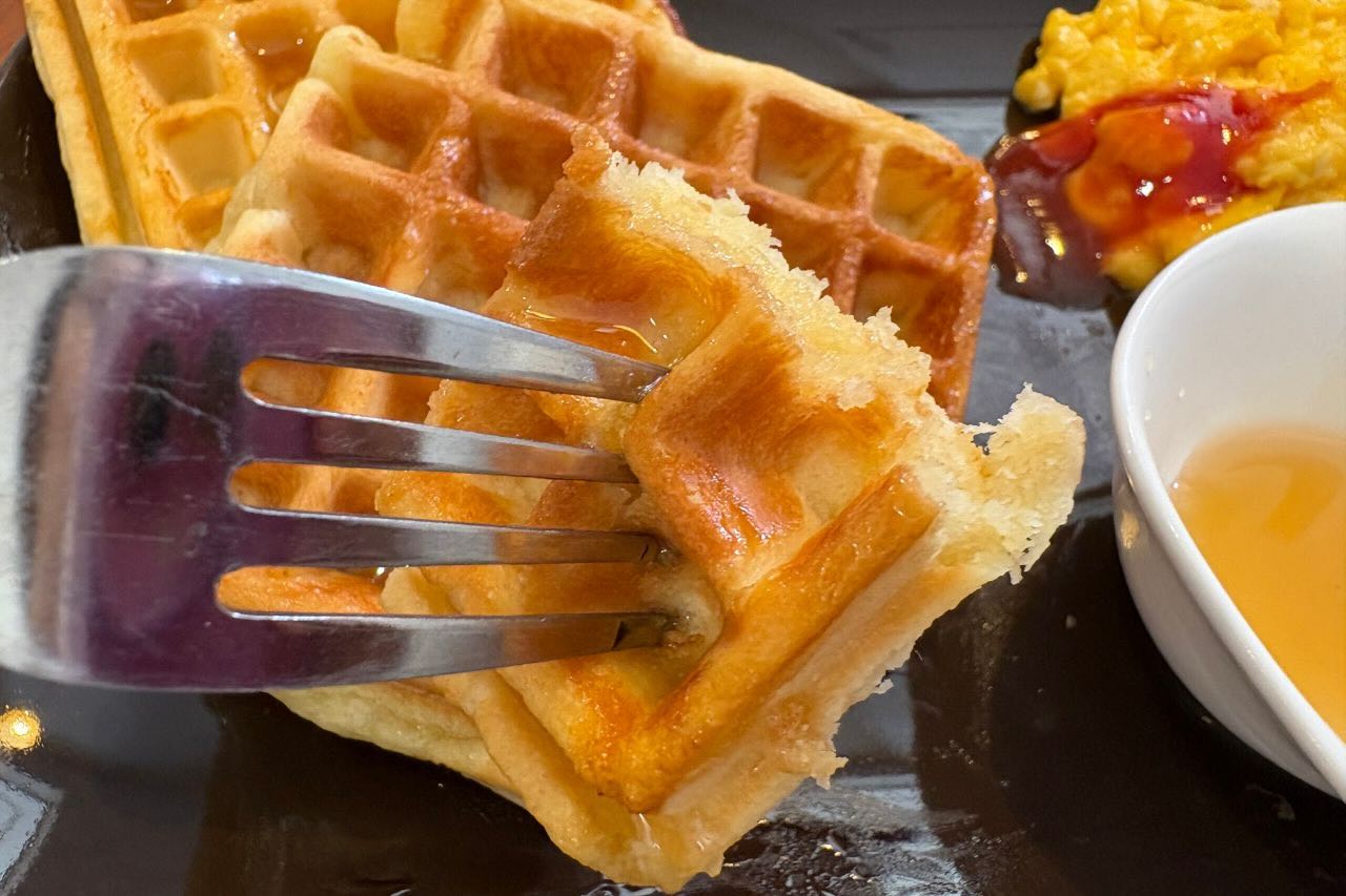 サクッと焼き上げたワッフルにナイフを入れると、弾力があります。添えつけのメープルシロップをつけて一口パクリ。