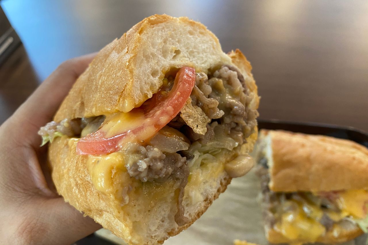 厚いバケットに、たっぷりの薄切りステーキ、トマトとレタス、とろっとチーズが入っており、サンドイッチの厚みがさらに増します。一人では食べきれないボリュームで、半分はテイクアウトしました。