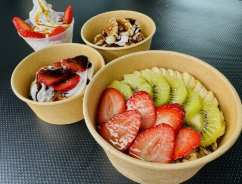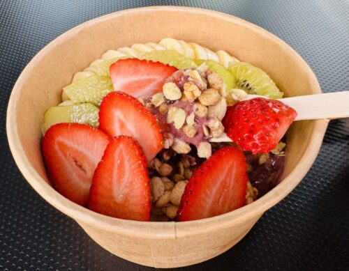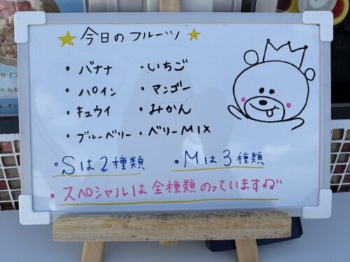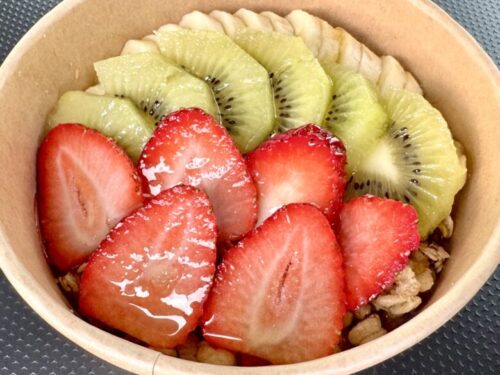 肥後ジャーナルでも何回か記事になったアサイーボウルですが、筆者は未経験。体に良さそうとか美味しそうだなぁ、と思っていたけれど詳しくは知らず。 とりあえず一番人気のⅯサイズのカップを選び、3種類の果物を選びます。私はバナナ、いちご、キウイにしました。(Mサイズ1,300円) (Sは2種類、スペシャルは全種類)