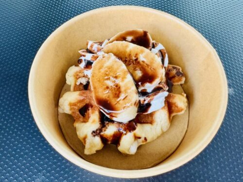 こちらはバナナワッフル。(300円)さくふわのワッフルの上にクリームとバナナ、そしてチョコレートソースがかかっております。