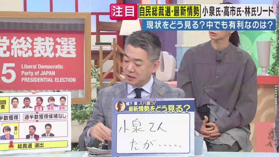 森永康平「やはりですね、元々5人出ているうちのあえて上3人を選べと言われたら、小泉さん、高市さん、そしてそこに続くのが林さんだったんですね。一応各メディアは小泉さんと高市さんの一騎打ちだ! みたいな話になってるんですが、例えば先月末に出た各新聞社の調査を見てみると、朝日とかが出している党員票、これの獲得予想を見ると進次郎さんが1位で、2位が林さんなんですよね。高市さんは3位になっている。あとは前回去年の総裁選の際も、結局石破さんが最後逆転という形になったわけですけど、その石破さんが今回出馬しないので、石破さんに入れた人たちってどこに流れるんだろうってなってくると、今の石破政権を基本的に踏襲するということ、そして自民をひとつにまとめるというような話を大きく出している小泉さん、林さん。こういうところに流れる可能性があるということですね。一方で、ここのところ小泉進次郎さん関連のネガティブなニュースが出てますよね、ネットの書き込みのヤラセがあったんじゃないかとか。あとまた昨日の夜だったかな? なんか党員を無理矢理減らしていたんじゃないかというような話が出てたりとか、どこまでがどれぐらいの事実なのかっていうのは今の時点は分からないですが、ここに来て結構ネガティブな情報が進次郎さんに対して結構出てきてますから、これなんか去年と一緒なんですよね。去年も『進次郎さんが行くんじゃないか』みたいな話が当初はあったものの、去年に関しては介護規制の緩和とか夫婦別姓だとか、自分からある意味エラーして落ちていった感じですが、今回はまたちょっと違う角度からネガティブな情報が徐々に出てきてしまってるんで。だからもしかしたら、林さんの可能性っていうのは、例えば1週間前や2週間前と比べると高まってきてるのかな、という印象は受けますね」