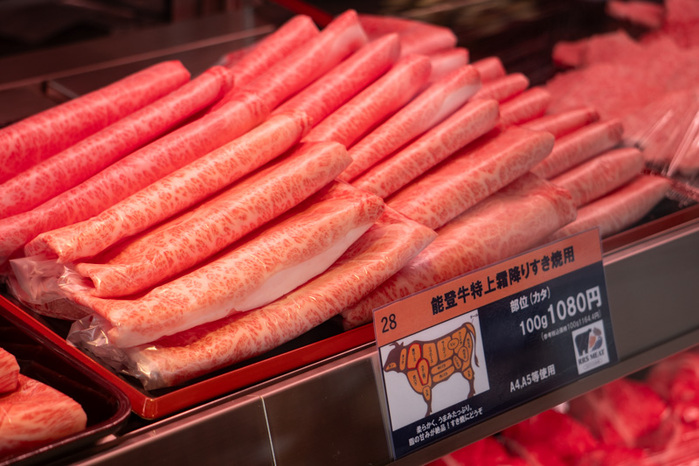 なかでも注目は、A4・A5ランク使用の霜降り肉「能登牛赤身すき焼き用(モモ)」(880円/100g)。