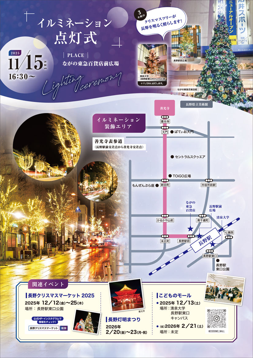 長野駅から善光寺までの「善光寺表参道(長野中央通り)」で『善光寺表参道イルミネーション』が2025年11月15日(土)~2026年2月23日(月・祝)まで開催。表参道の並木約1.8kmが約38万球のLEDで彩られます。初日の11月15日(土)は「ながの東急百貨店」前広場と、長野駅前広場にてイルミネーションと周辺3カ所のクリスマスツリーの点灯式を含むオープニングセレモニーも。「ながの東急百貨店」前広場では長野市出身のシンガーソングライター・ななせさんと、清泉女学院大学・短期大学の学生によるハンドベルのコンサートが行われます。