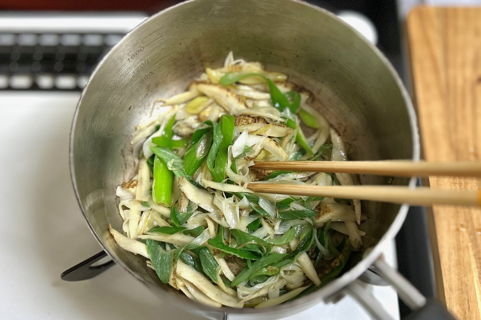 鍋にごま油を熱し、水切りしたごぼう・ねぎを炒める。香ばしい香りが立ったら、ごぼうのさらし水とまいたけを加え、火にかける。