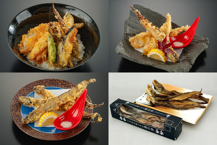 《画像:「幻魚天ぷら丼」(左上)、「幻魚干物天ぷら」(左下)、「幻魚干物天ぷら盛り合わせ」(右上)、「焼幻魚」(右下 いずれもうみてらす名立提供)》
