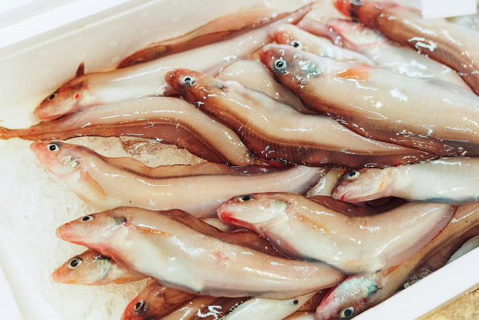 ゲンギョの正式名称はノロゲンゲ。日本海やオホーツク海の水深200~1800mに生息する、細長い体長20cmほどの深海魚で、全身がヌルヌルしたゼラチン質に覆われている。同区では9月から5月にかけての甘エビ漁の底引き網で一緒に引き揚げられるが、水分を多く含んでいるため鮮度劣化が早く、流通不可能な魚だった。