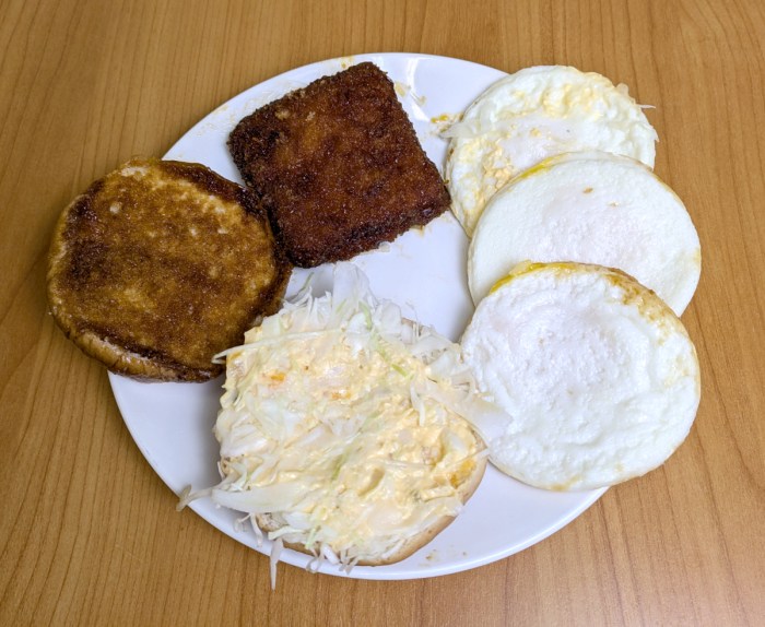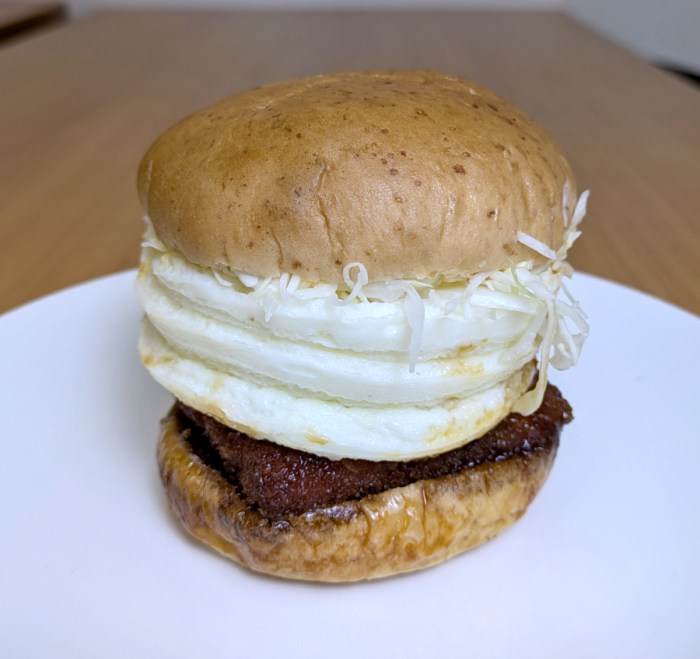 食べる前にバラして中身を見てみると、バンズとバンズとの間には、タルタルソース・千切りキャベツ・目玉焼き風オムレツが3枚・和風カツが挟んであった。