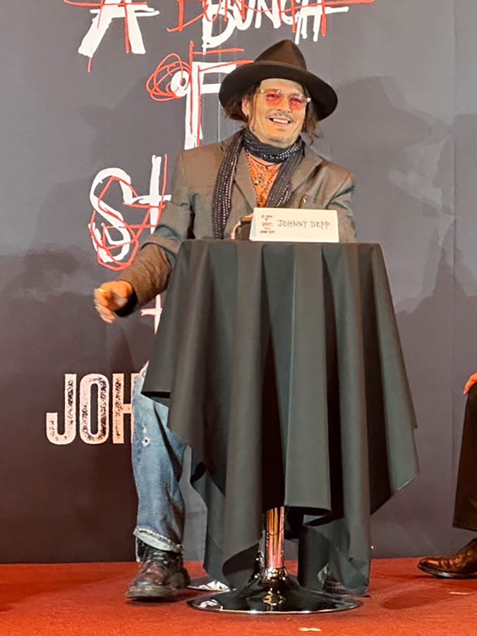 来日中のジョニー・デップも、予定時間から約1時間半遅れて記者会見に登壇。 展覧会について「子どもの頃から絵を描くことが好きで。ずっとガレージに置いて、誰にも見せていなかった作品を公開することになった。日本、東京は常に美しく、素晴らしいアートを発信してきた街だと感じている。感性が豊かで意見が正直に分かれるだろう東京での開催はチャレンジだと思う。影響を受けた人物の肖像画など、ぜひ堪能してほしい」とピーアール。