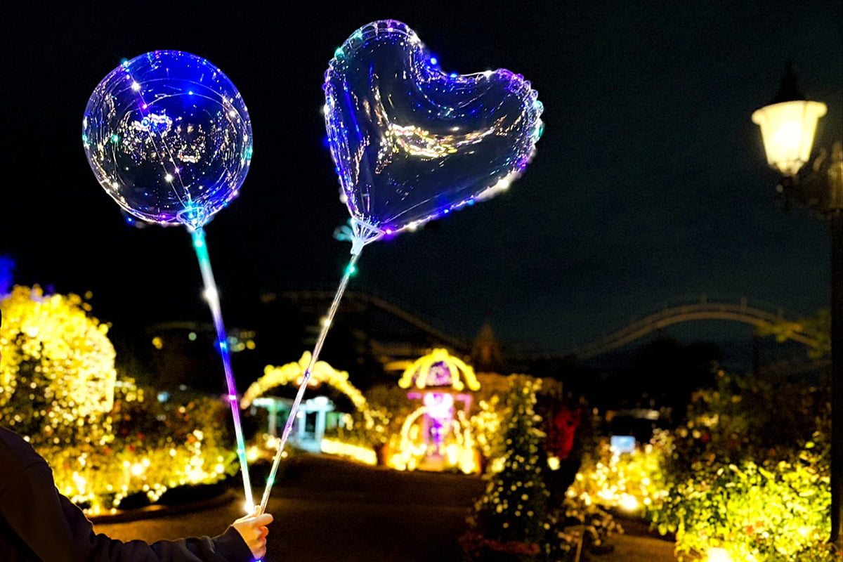 バラがテーマの華やかなイルミネーションの中、夜の遊園地で思いきり楽しんでくださいね♪
