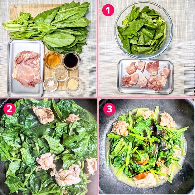 ① 鶏もも肉は一口大に切り、【A】をもみ込む。ほうれん草は水洗いし、根元を切り落として4センチ幅の長さに切る。