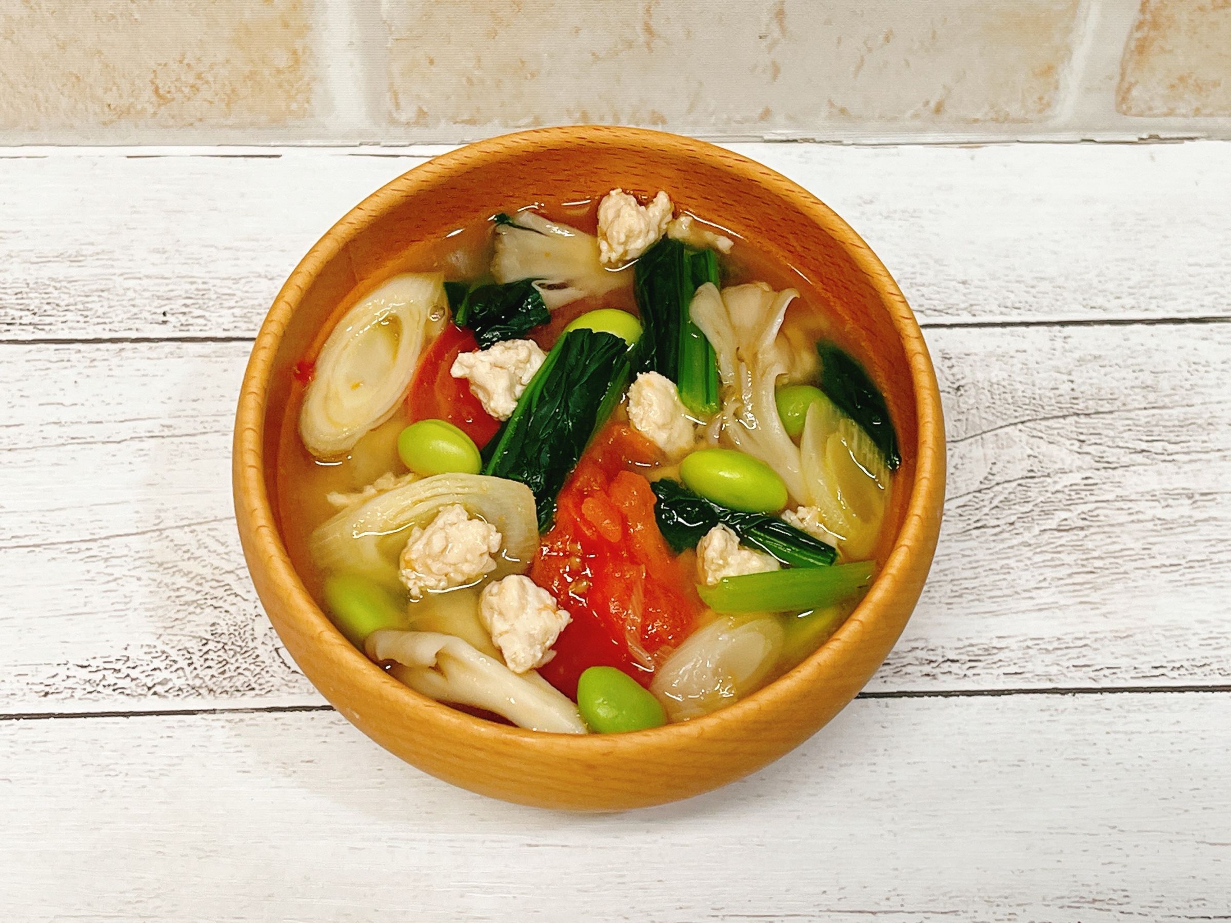おかず味噌汁でタンパク質アップ!ひき肉と枝豆の具だくさん味噌汁!