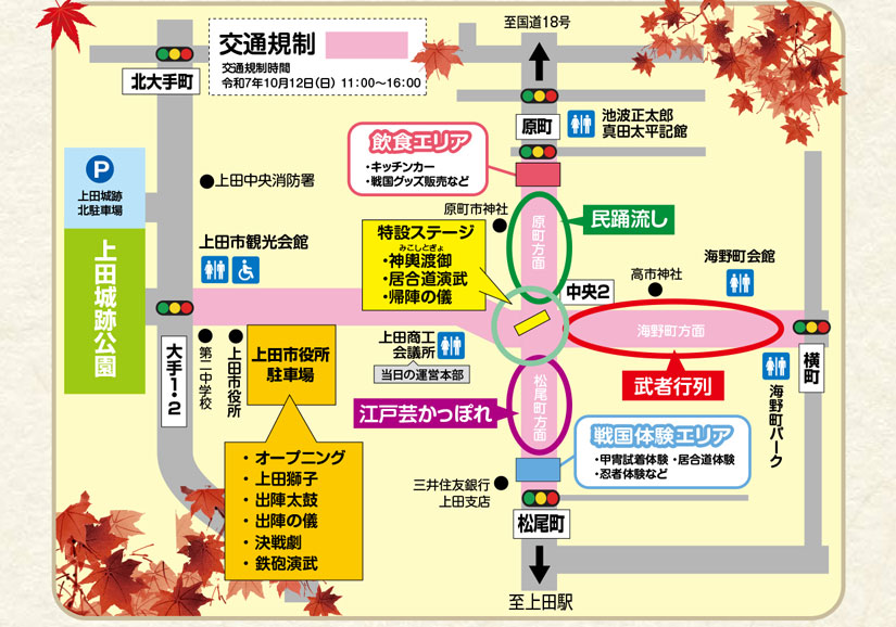 当日は11:00〜16:00まで上田城跡周辺や市役所周辺、中心市街地の広範囲で交通規制が実施されます。