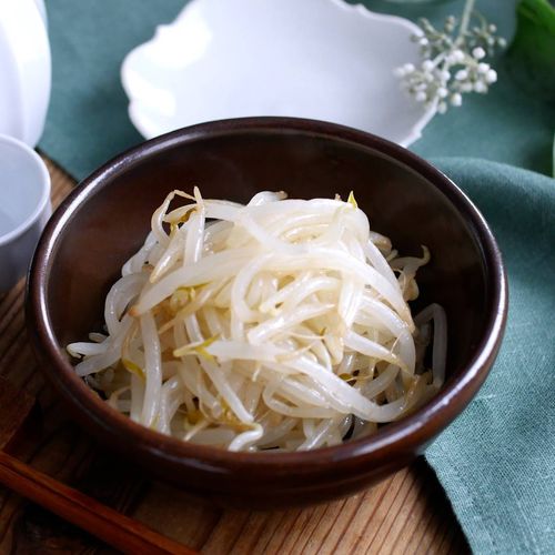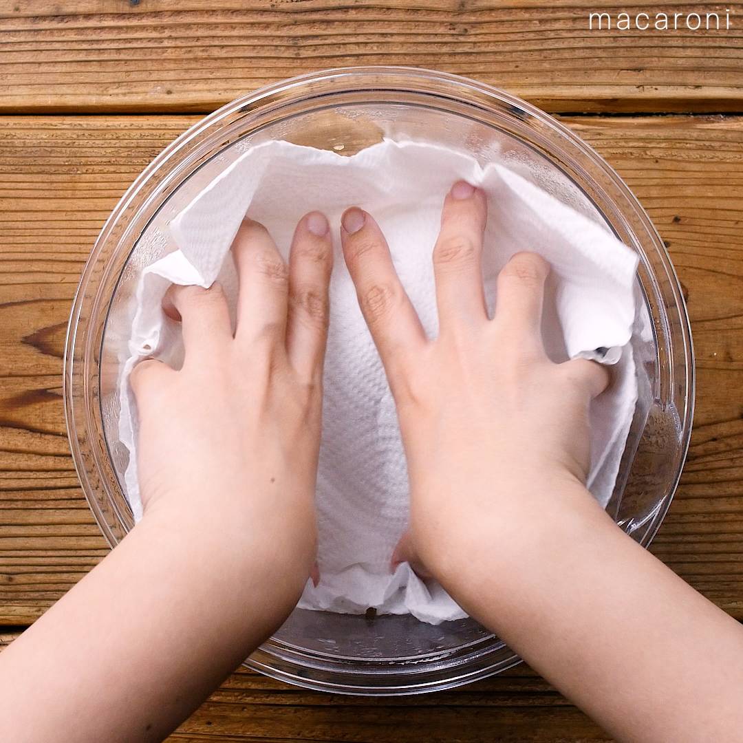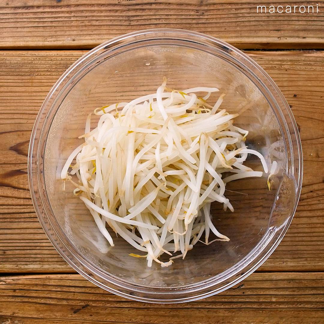 1: もやしを耐熱容器に入れてふんわりとラップをかけ、レンジ600Wで2分加熱します。