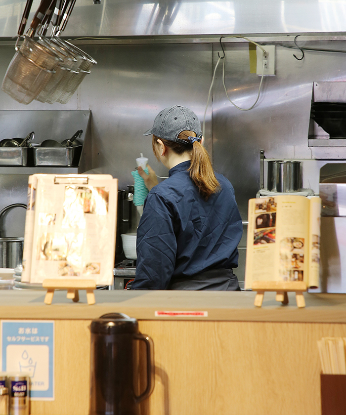 宍戸さん:今まではお客様から見えない調理場でお菓子をつくっていましたが、お客様に見られながらラーメンをつくるオープンキッチンにはプレッシャーを感じましたね。疲れていても疲れた顔をしないように気をつけています(笑)。あと、お菓子づくりは分量がきっちりと決まっているのに対して、ラーメンのレシピはそこまでシビアではないんです。時期によって素材の味が変わってくるので、こまめに確認しながら安定した味を提供するよう、いつでも最高のクオリティが保てるよう心掛けています。あとは、何かあったらいつでも応対できるよう、できるだけお客様の顔を見ながら目配りするようにしています。応対する際もお客様の目を見て話すように気をつけていますね。