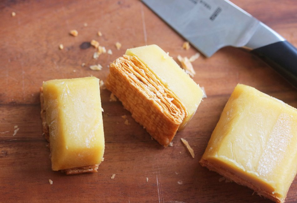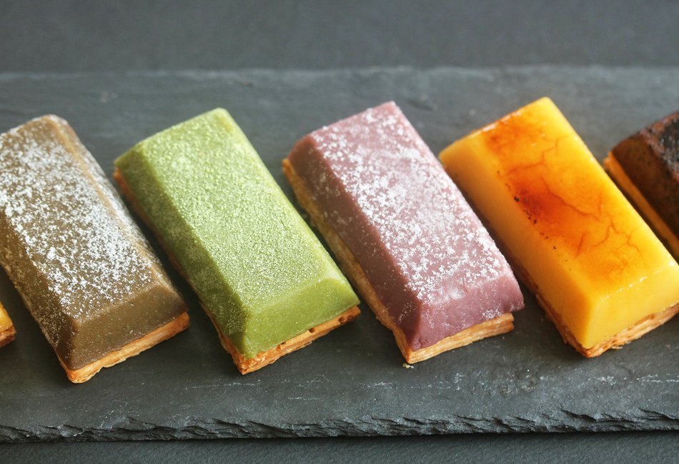 普通のスイートポテトとは一線を画していますが、それもそのはず。OIMOさんの生スイートポテトは材料にもこだわり、宮古島産の紅いもや長期間寝かせることで甘く熟成させた国産のさつまいも、宇治抹茶、北海道産のクリーム、バター以外の油脂分を使用していない248層のパイなど厳選したものを使用しているそう。