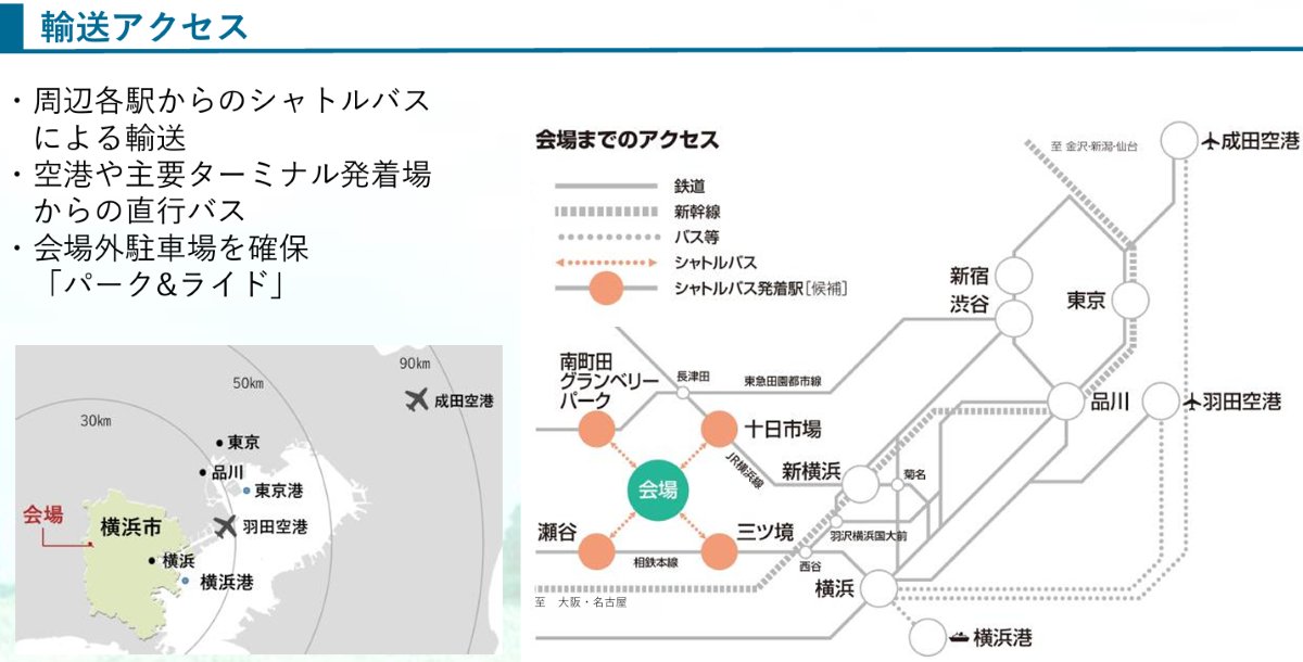 会場へのアクセス手段として過去には新交通システムの導入なども検討されてましたが、現在の計画としては、会場周辺の4駅(相鉄線の瀬谷駅・三ツ境駅、JR横浜戦の十日市場駅、東急田園都市線の南町田グランベリーパーク駅)からのシャトルバスや、空港・主要ターミナル駅からの直行バスなどが、アクセス想定となっています。