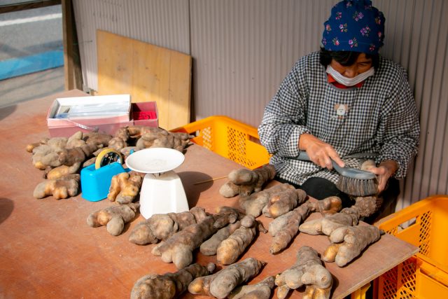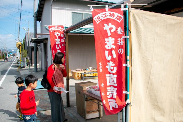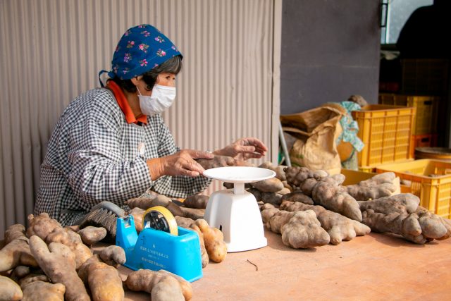 そこには、収穫した山芋の選別作業をしながら、店番しているお母さんが。