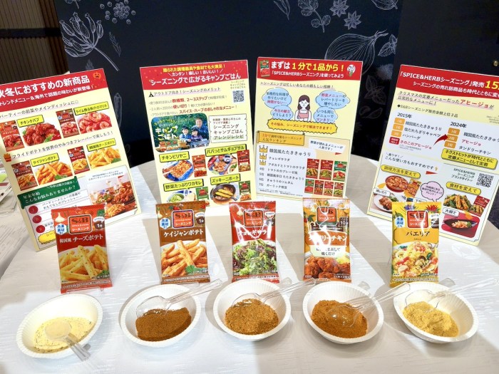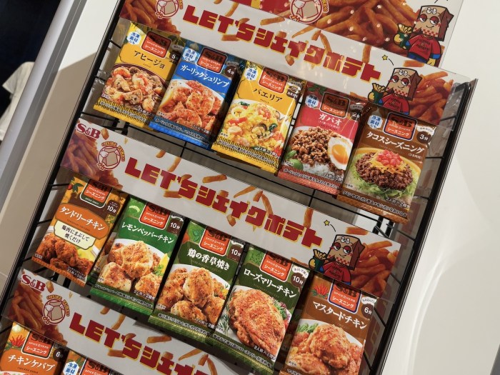それはエスビーのブースだった。ああなるほど、フライドポテト用のシーズニングが発売されたのか……と思っていたらどうも違う。ブースには見慣れた既存商品がずらりと並んでいたのだ。