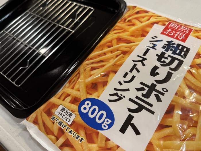 参加者は自分ひとりだけど、ポテパ(ポテトパーティー)を盛大に開催すべく800gの大容量ポテトを用意。せっせと揚げていく。