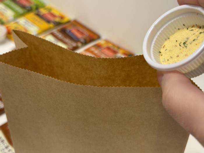 シーズニングも準備完了! 台所が実験室みたいになってきた。シェイクする容器はその辺のものでもいいかもしれないが、衛生面や油もれを考えると食品衛生法に適合した紙袋がいいと思う。