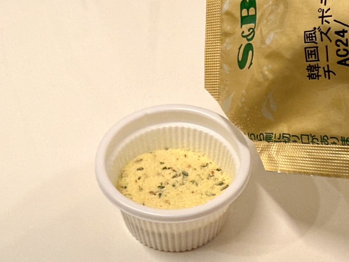 まずは鉄板「韓国風チーズポテト」から。これはフライドポテト用に作られたシーズニングなので、マズいはずがない。勝ち確である。